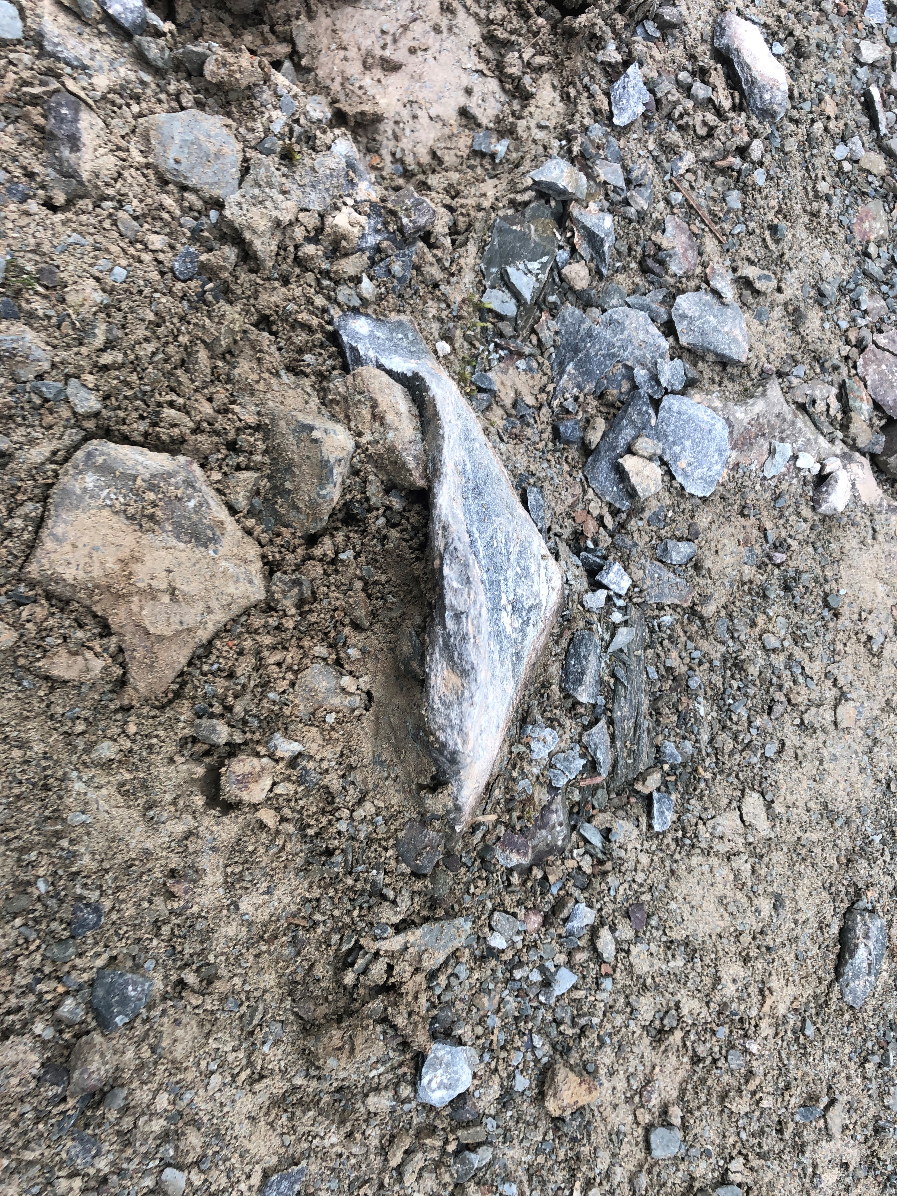 This rock blew a $20,000 front tire. It happened because ATVs travelled during the mud season, March 1 to April 30, driving over 20 km/h. OHVs displace most of the gravel between rocks, making roads impassable for cars, pickup trucks, and logging trucks without thousands of dollars of repairs.